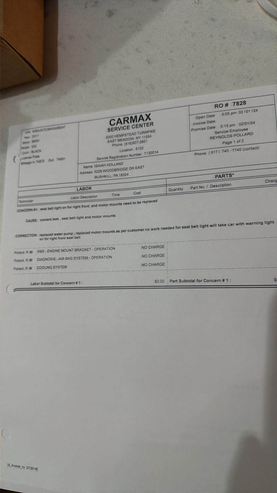 (Some CarMax warranty repairs performed at no charge to customer.)